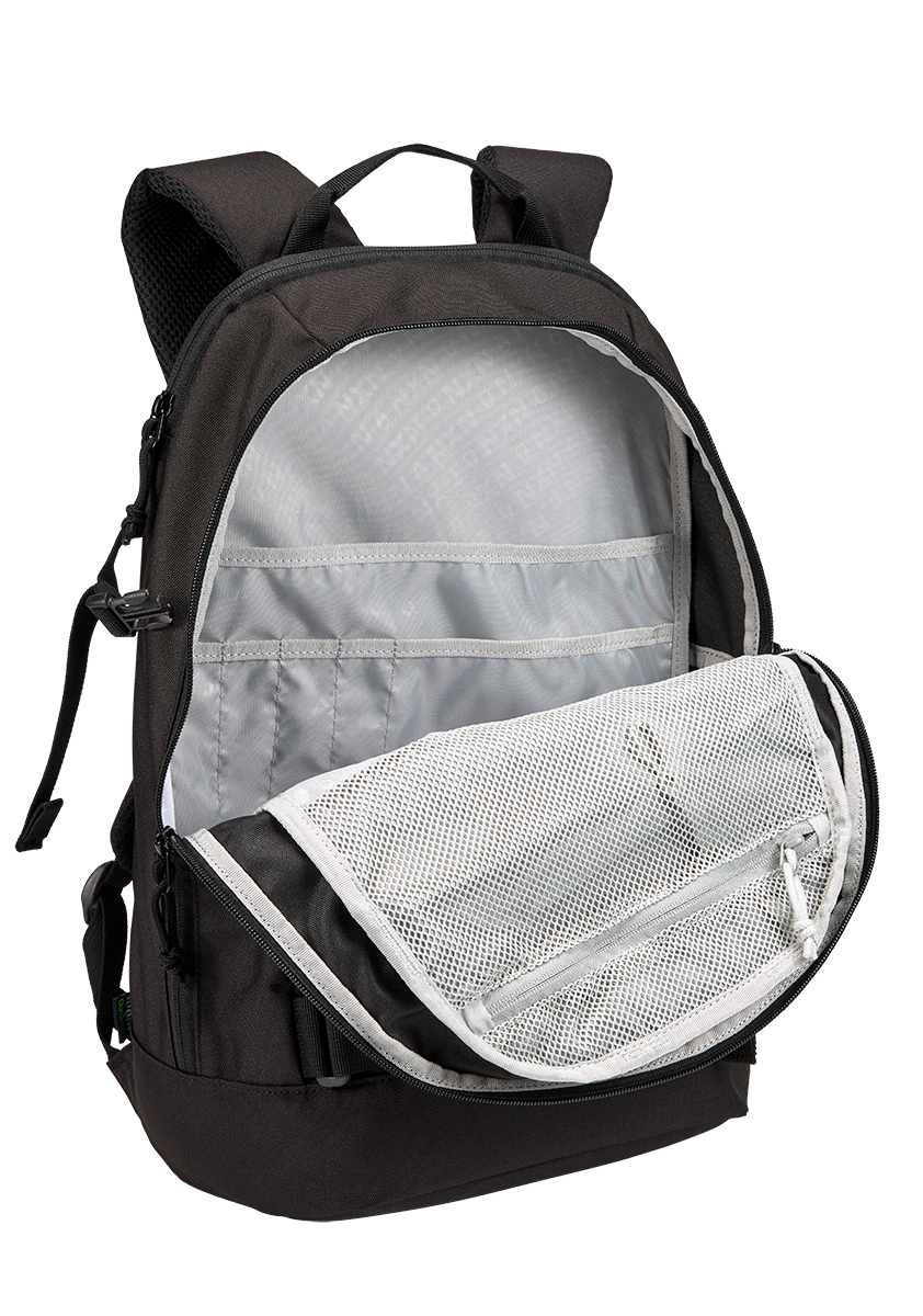 Large main compartment with internal organization pockets. Laptop (15"") storage with external zipper access. External skate straps, water bottle pocket, zippered stash pocket, and multi-use gear loop. Small removable mesh pocket attached to the strap, great size for travel sized hand sanitizer.
