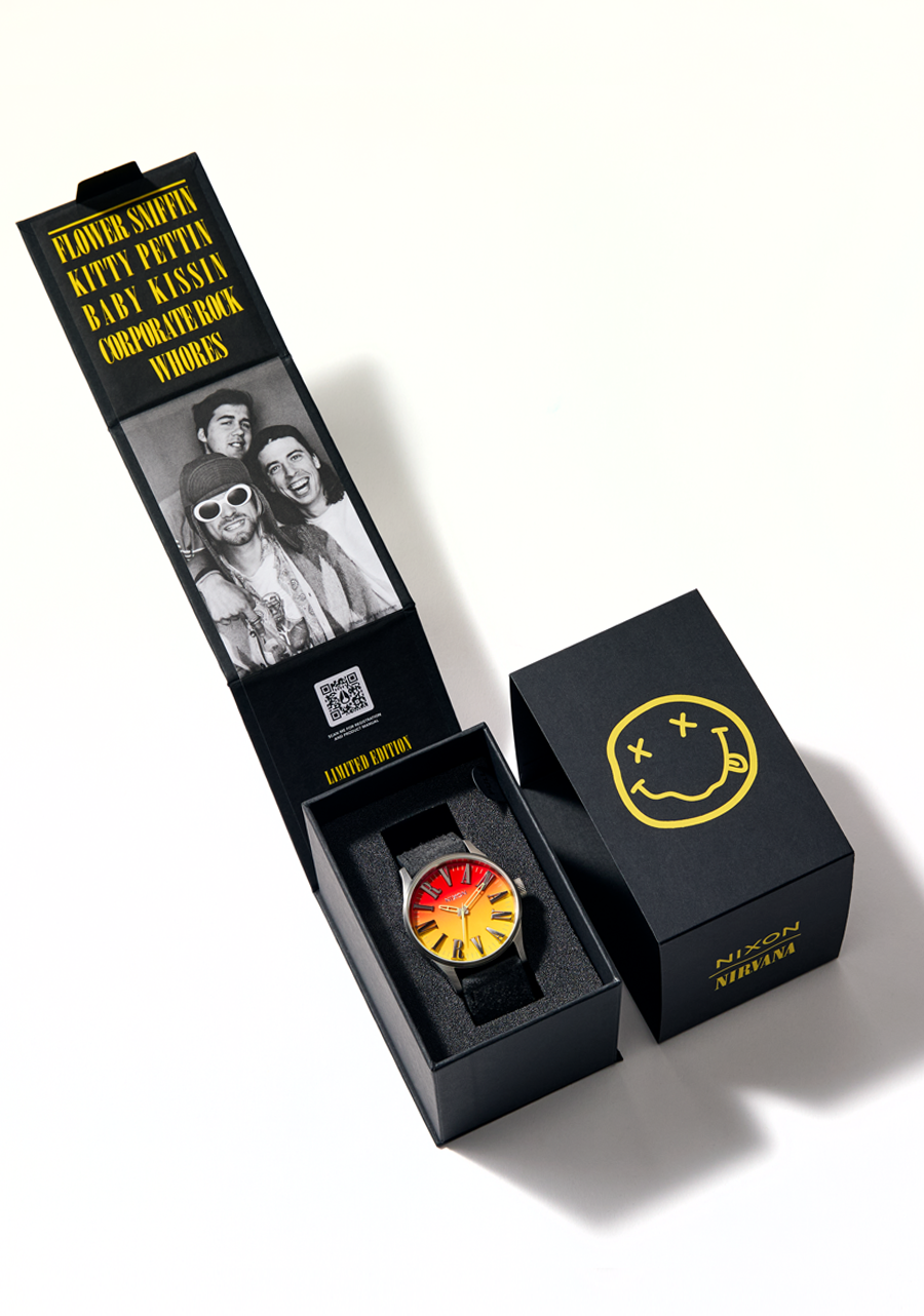 A band of this magnitude deserves a watch like no other. The Nirvana collection features the Sentry Wobble, a case bent to fit the shape of their iconic smiley face graphic. Accompanying the Wobble is the Sentry Leather with a fuzzy sweater-like feel to the band and a polarizing sun-ray dial with angled Nirvana letters as the indices. Lastly, the Time Teller's minimal profile packs a punch with a hit of a black-on-black smiley face and yellow Nirvana logo and text style.