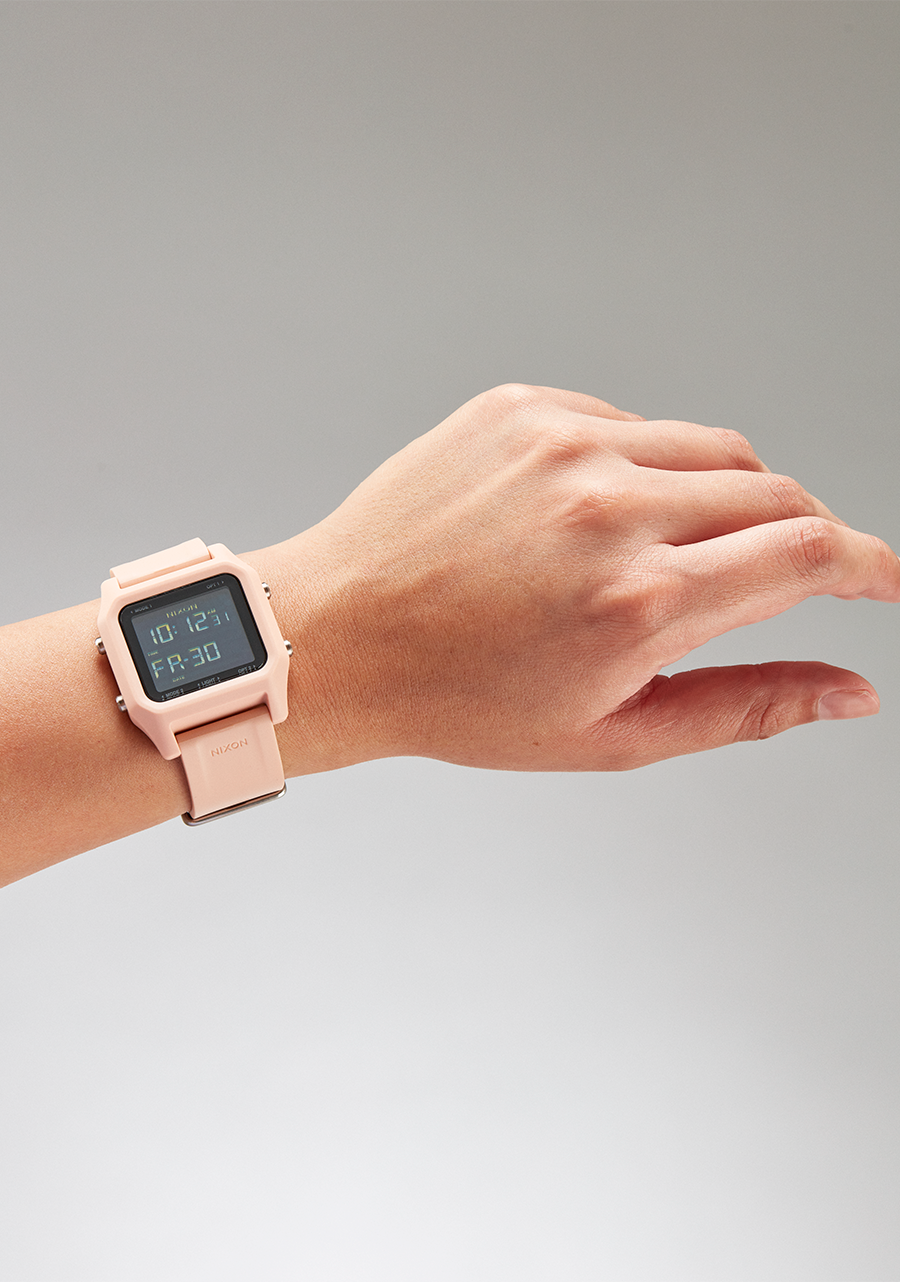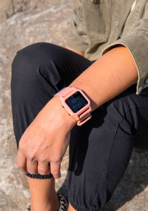 39mm custom injection molded fiber reinforced recycled ocean plastics case with a 100 meter / 10 ATM water rating. Comes with stainless steel pushers, hardened mineral crystal, solid stainless steel screw down caseback and screw pin lugs.